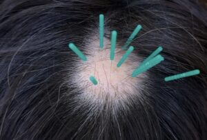 当院では、直接的に円形脱毛症を引き起こしている患部である頭皮に鍼を置鍼します。